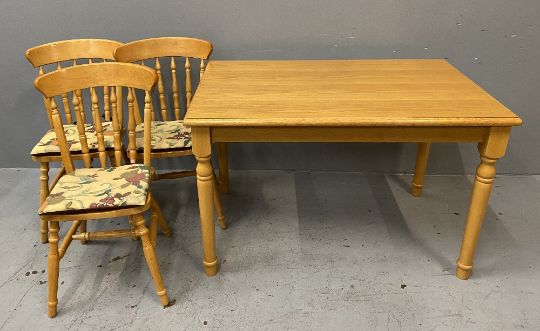MODERN LIGHT WOOD KITCHEN TABLE, 78cms H, 120cms W, 77cms D and three spindleback chairs