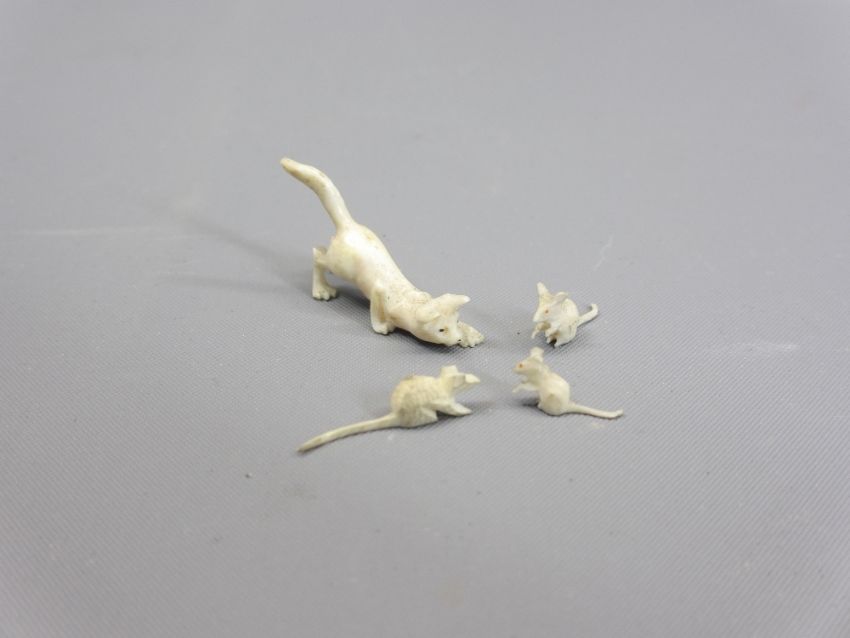 MIXED COLLECTABLES GROUP - a champleve enamel pocket watch holder, a cast metal coal painted parrot pin cushion in the style of Franz Bergman, porcelain model of a seated laughing dog, two moulded frosted glass animal ornaments, white metal dog and a selection of plastic and carved bone figures and animals