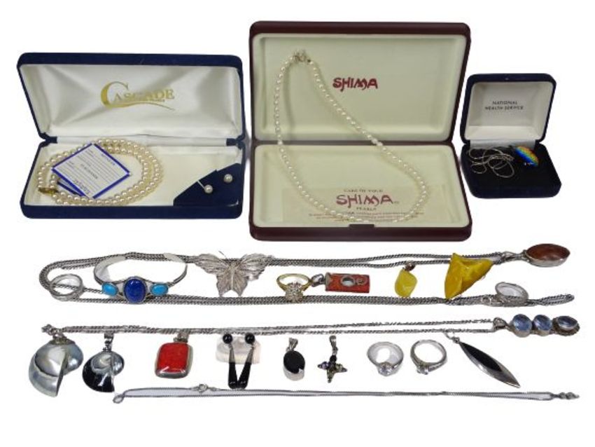 STERLING, 925 & OTHER MODERN JEWELLERY GROUP - a rainbow type pendant necklace in National Health Service box, silver muff chain with amber type silver mounted pendant drop, 74cms overall L, other semi-precious stone set jewellery including four CZ set sterling silver rings, cased simulated pearls and pendants, ETC