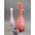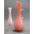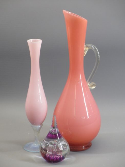 A TALL NARROW NECKED PINK GLASS JUG - with plain scrolled handle, 40cms H, a pink Milk glass narrow necked vase on a plain circular base, 30cms H and a floral paperweight, maker unknown