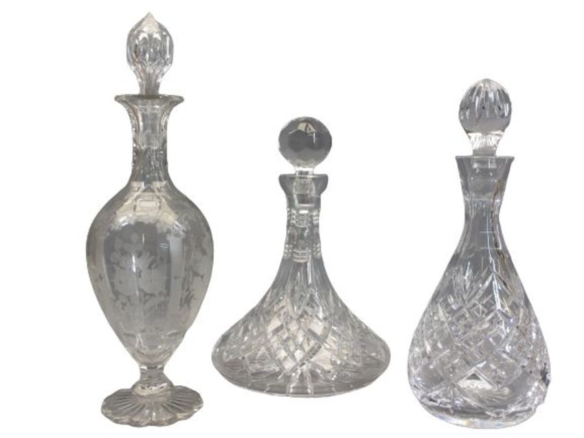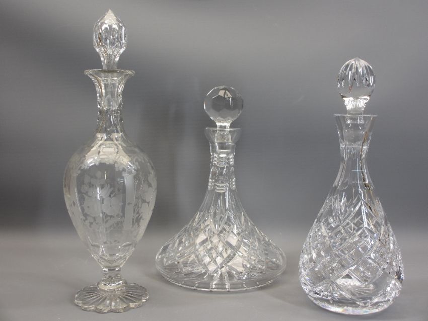 VICTORIAN & LATER DECANTERS WITH STOPPERS (3) - to include a facet cut and engraved example on a pedestal and petal foot, 35cms H