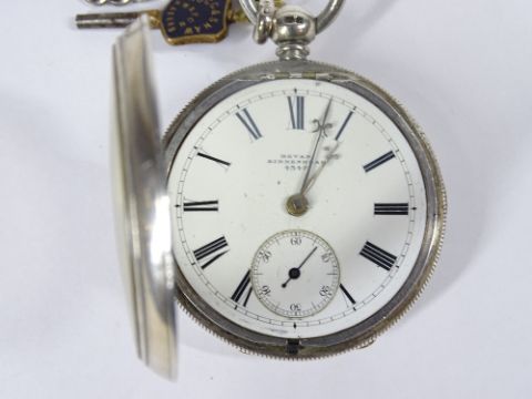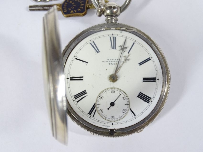 VICTORIAN CHESTER SILVER CASED SINGLE FUSEE POCKET WATCHES (2), the first example 1873 with white enamel dial marked 'Bevan Birkenhead', set with Roman numerals and Arabic subsidiary seconds dial, the movement engraved 'Edward Bevan, Birkenhead', No 4347 with dust cover, appears working when listed, attached silver Albert with clip, T bar and swivel fob plus additions, with winding key, 43mm case diameter, 5ozt gross complete, the other dated 1898 marked 'D L Griffith, Denbigh', to a white enamel dial set with Roman numerals and Arabic subsidiary seconds dial, the movement engraved with similar detail, numbered 7283, no dust cover, not currently running, chain loose, 53mm case diameter with multi-size winding key, 4ozt gross