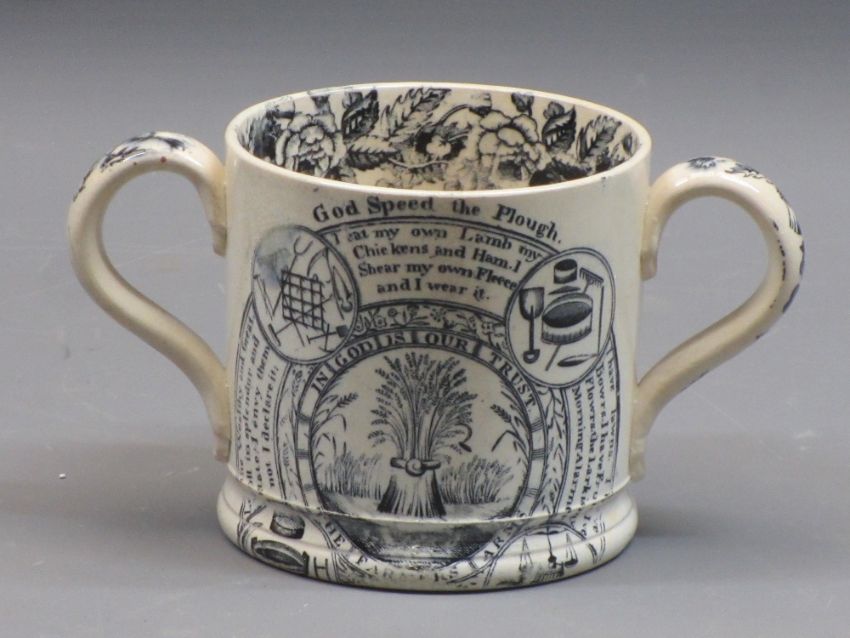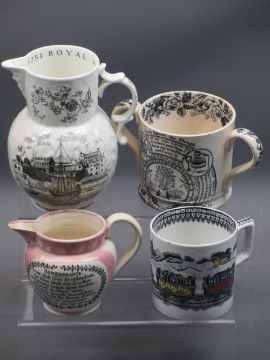 VICTORIAN & LATER CERAMICS - 4 items to include a Sunderland lustre jug with printed scene of Sunderland Bridge, 9cms H, mug with print decoration of a vintage steam locomotive and carriages, 9cms H, two-handled tankard 'God Speed the Plough', 10cms H and a Royal Worcester centenary jug 1751 - 1951, 16.5cms H