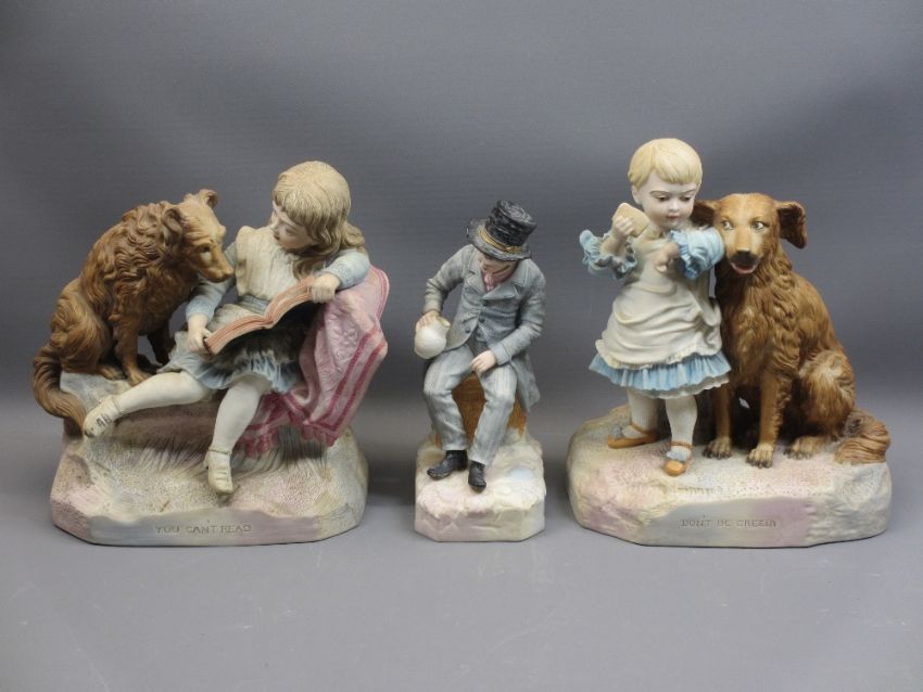 ROBINSON & LEADBEATER 19TH CENTURY BISQUE PORCELAIN FIGURINES (3) - to include one of a seated young girl with a dog by her side, titled to the front 'You can't read', 30cms H, 30cms across, a young girl with biscuit in her hand and dog by her side titled to the front 'Don't be greedy', 31cms H, 25cms across and a smaller example of a seated young man in top hat looking into a jug with a grimaced face, 26.5cms H, all impressed 'R & L' to the backs