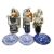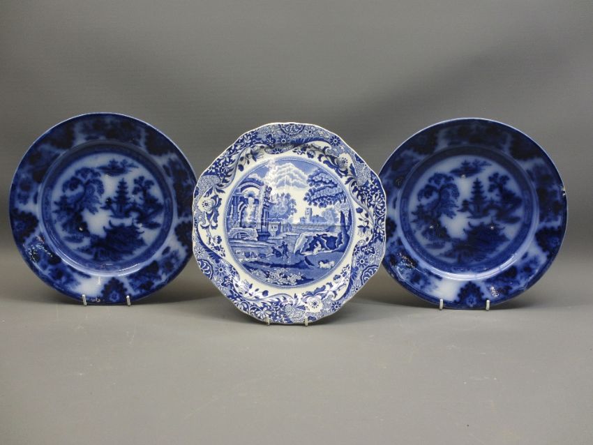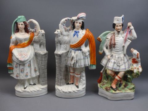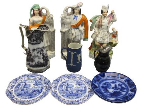 VICTORIAN STAFFORDSHIRE FLATBACK FIGURINES, Flow Blue and other Blue & White plates and three various jugs, the Staffordshires include a pair of a kilted man and a woman with sheep by their sides, 41cms H, the other of a kilted huntsman with dog, 40cms H