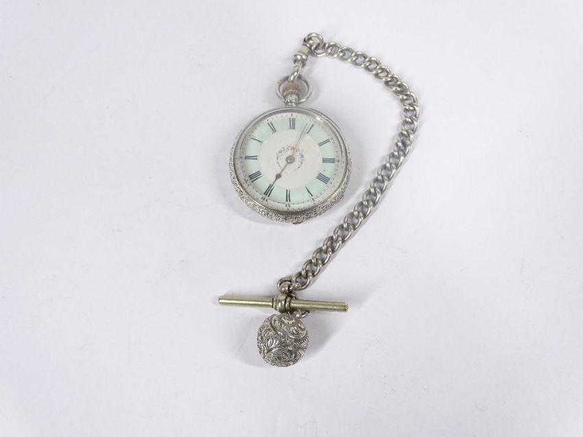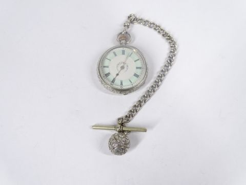 SWISS 935 SILVER LADY'S FOB WATCH - on a white metal Albert with T bar and ball fob, enamelled light blue and white dial having central floral decoration set with Roman numerals, the case chase decorated, the dust cover inscribed 'Watch Maker by Warrant to The Queen examined by J W Benson 62 & 64 Ludgate Hill, London, Swiss made', appears in working order at time of listing