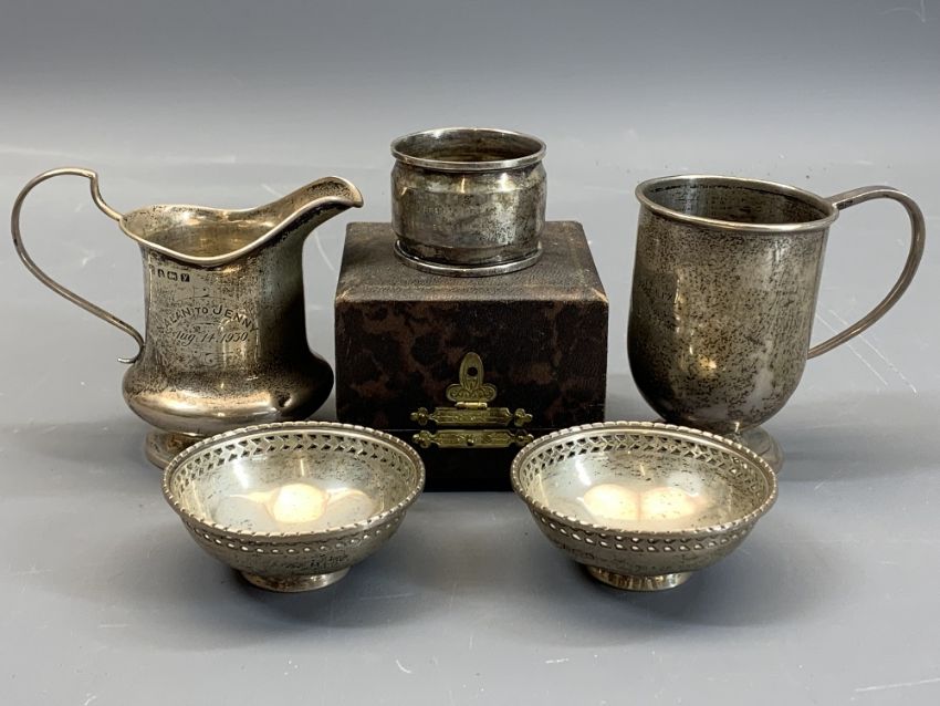 SMALL SILVER, 5 ITEMS - all having Birmingham hallmarks to include an 8.5cms H cream jug 1923, Maker A & J Zimmerman Ltd, inscribed 'Alan to Jenny August 14 1930', 8cms H christening tankard, 1929 Maker John Rose inscribed to the front 'Geoffrey Felix September 13th 1933', boxed napkin ring, 1932, same maker and inscription as the tankard, and 2 x 6.5cms diameter bowls, 1931, Maker Adie Brothers Ltd, 7.1ozt gross