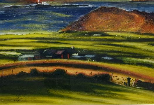 WIL ROWLANDS fine large, coloured print - coastal scene with distant lighthouse and farmstead with farmer and dog at a gate, signed and dated '83 and with guild stamp, 50 x 72cms
