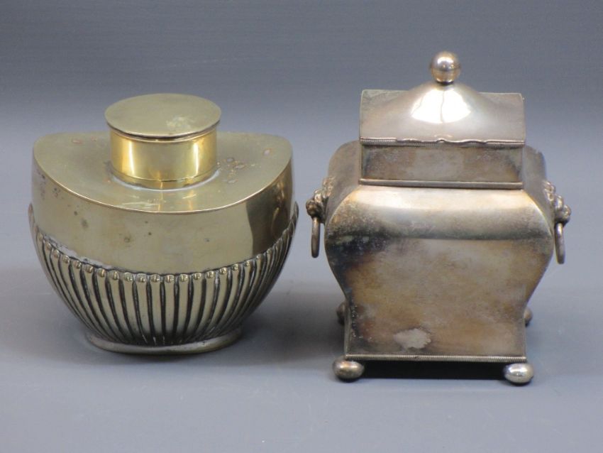 EPNS TABLEWARE - 5 items to include a quality mounted crackle glass jug, 26cms H, two small tea caddies, Georgian style spoon warmer and an oval lidded biscuit box on stand, 17cms H, 23cms across