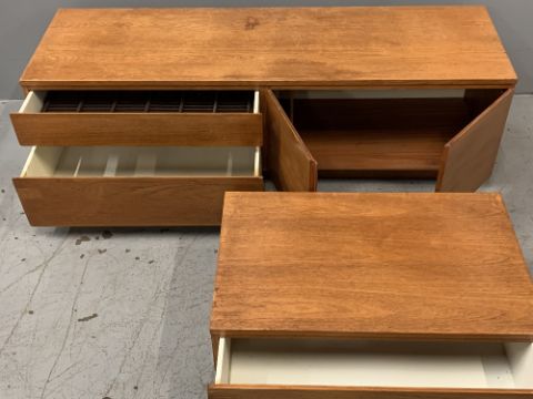 MID-CENTURY SIDEBOARD, teak effect, two drawers and two doors, 51cms H, 168cms W, 54cms D and a similar single drawer chest, 35cms H, 84cms W, 54cms D