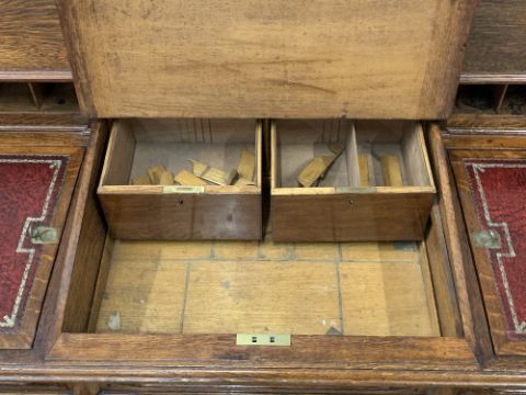 VICTORIAN GOTHIC REVIVAL DESK with tooled leather effect top and sloped centre section, twin pedestals having inner drawers, 95cms H, 138cms w, 79cms D