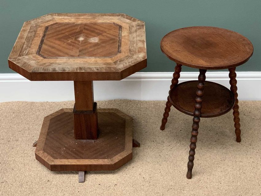 FURNITURE ASSORTMENT - Art Deco style octagonal top occasional table with lower tier, 53cms H, 51cms W, 51cms D, an antique mahogany side table on turned supports, 71cms H, 65cms W, 42cms D, a vintage Canterbury (no legs), with base drawer, 33cms H, 47cms W, 39cms D, a vintage mahogany tripod two tier circular topped occasional table, 52 x 36cms and a single pedestal drop side coffee table, 46cms H, 22cms W, 92cms D