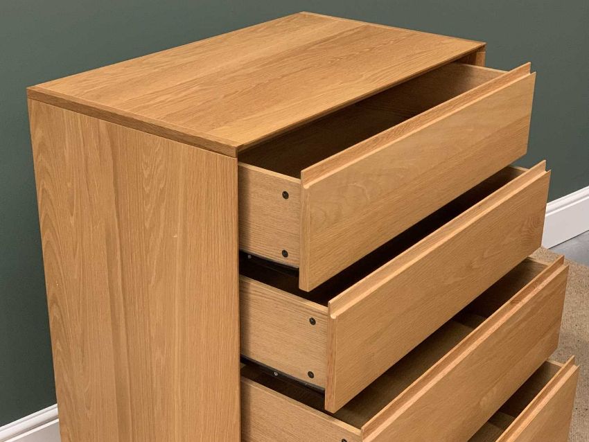MODERN CHEST OF FOUR DRAWERS in light wood, 101cms H, 80cms W, 47cms D and a modern ottoman, 46cms H, 130cms W, 41cms D