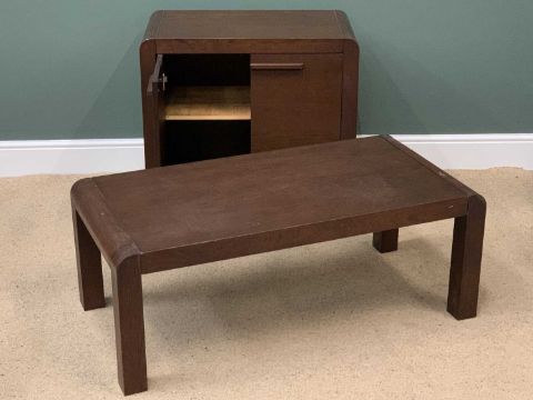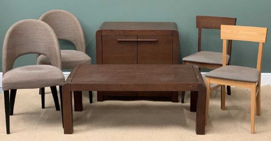 MODERN FURNITURE ASSORTMENT - 'Designer' coffee table, 45cms H, 120cms W, 60cms D and a two door cupboard, 74cms H, 82cms W, 45cms D, both with sleek curved tops, also a pair of fancy modern chairs, 88cms H, 52cms W, 48cms D and two similarly upholstered dining chairs, 84cms H, 46cms W, 42cms D