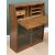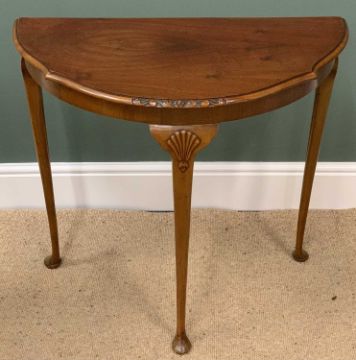 FURNITURE ASSORTMENT - polished oak drop front bureau with lower glazed doors and shelves, 100cms H, 84cms W, 25cms D, a mahogany half moon table with carved fan detail, 72cms H, 77cms W, 38cms D and a polished oak hutch cupboard with single drawer over two cupboard doors, on turned and block supports, 73cms H, 62cms W, 33cms D