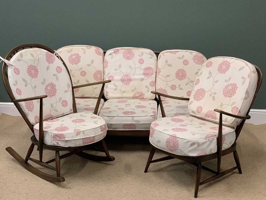 VINTAGE ERCOL THREE PIECE SUITE comprising sofa, 83cms H, 180cms W, 91cms D; an armchair, 88cms H, 72cms W, 85cms D and a rocking chair, 95cms H, 75cms W, 81cms D