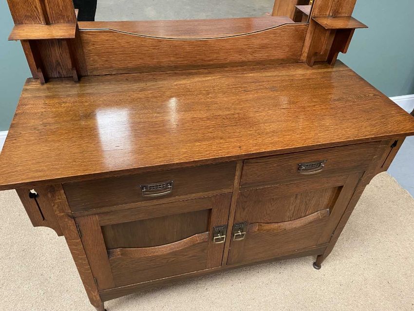 ARTS & CRAFTS OAK SIDEBOARD - the mirrored top section with copper heart and boating detail, the base with twin cupboard doors and drawers, on turned supports, 180cms H, 159cms W, 60cms D