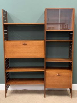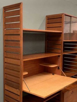 STAPLES 'LADDERAX' TEAK LOUNGE UNIT comprising freestanding uprights, adjustable shelves, drawers and cupboards on metal braces, 201cms H, 156cms W, 42cms D