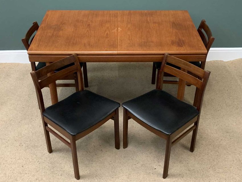 MID-CENTURY TEAK TYPE DINING FURNITURE - White & Newton Ltd 'Peterfield' extending dining table, 74cms H, 137cms W, 89cms D (214cms extended) and a set of four similar period dining chairs, 73cms H, 47cms W, 40cms D