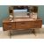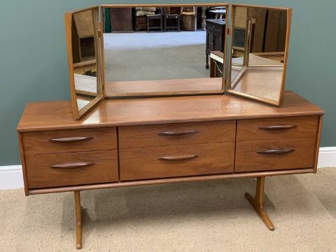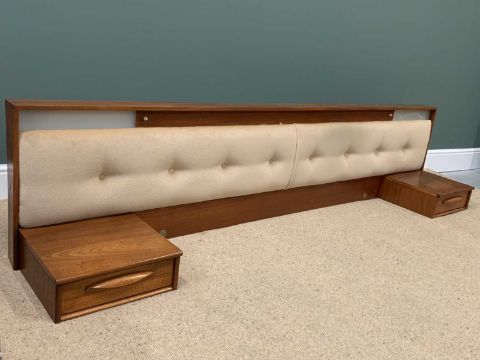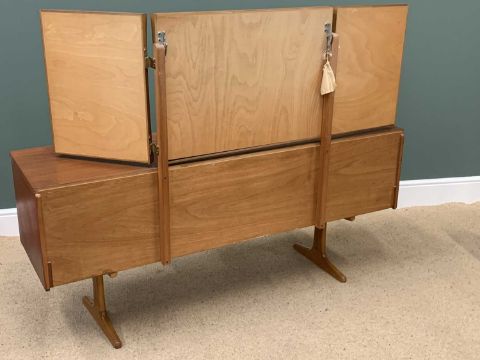 MID-CENTURY TEAK TYPE BEDROOM FURNITURE by Austin Suite comprising triple wardrobe, 215cms H, 155cms W, 65cms D, double wardrobe, 215cms H, 95cms W, 65cms D, dressing table with triple mirror and stool, 120cms H, 154cms W, 47cms D and a headboard with side drawers, 53cms H, 232cms W, 45cms D
