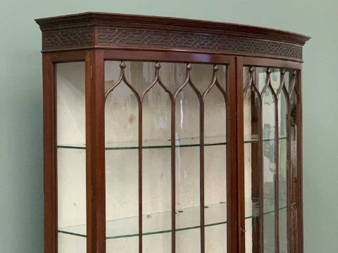 QUALITY BOW FRONT DISPLAY CABINET - antique mahogany with twin glazed doors, carved plinth and apron and hairy paw feet, 198cms H, 123cms W, 35cms D