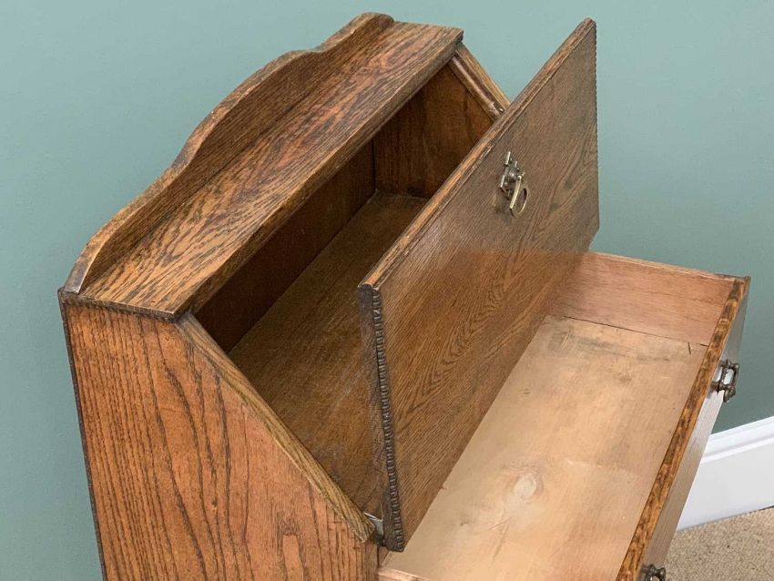 ARTS & CRAFTS STYLE POLISHED OAK BUREAU with two lower shelves and central drawer, 105cms H, 64cms W, 38cms D and a square topped polished plant stand on tapered supports, 91cms H, 25cms square top
