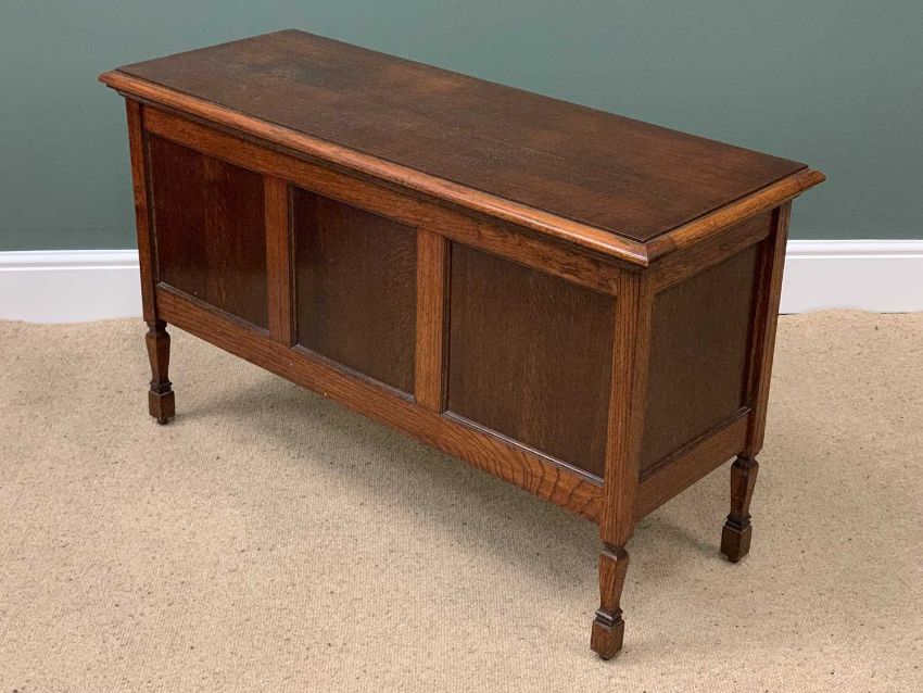 POLISHED OAK BLANKET BOX with a three panelled front, on block supports, 69cms H, 116cms W, 45cms D
