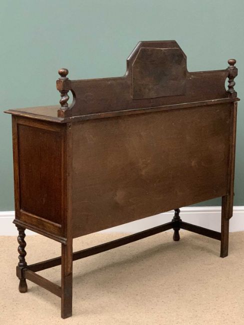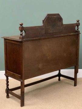 FURNITURE ASSORTMENT - vintage oak sideboard with mirrored railback, two drawers and two cupboard doors, on twist supports, 123cms H, 122cms W, 44cms D, a similar era rexine seated elbow chair on turned and block supports, 110cms H, 55cms W, 40cms D and a polished standard lamp, 154 x 35cms