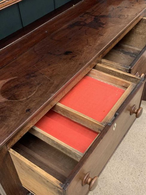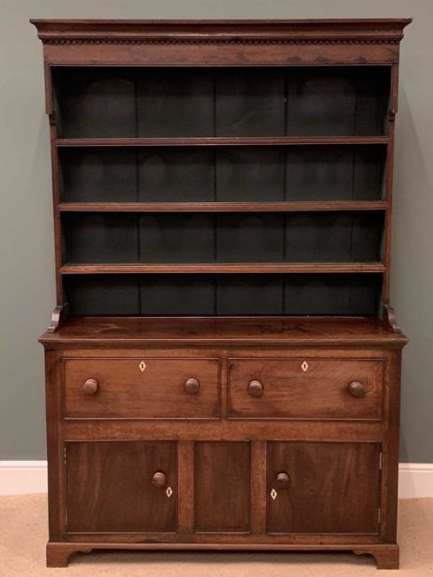 19th CENTURY OAK & MAHOGANY DRESSER, the base with two deep drawers over two cupboard doors and sliding dividers to the interior of the drawers, the three shelf rack with dentil type cornice, 211cms H, 140cms w, 51cms D
