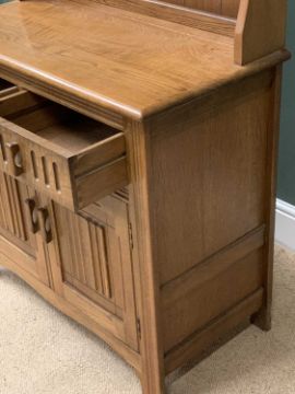 FARMHOUSE TYPE FURNITURE ASSORTMENT in medium oak comprising compact two door dresser and rack, 181cms H, 91cms W, 47cms D, similar extending dining table, 76cms H, 53cms W, 122cms D (closed) and a quantity of six various chairs