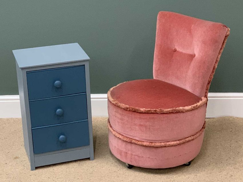 BEDROOM FURNITURE - circular based upholstered bedroom chair 73cms H, 53cms W and a painted narrow three drawer chest, 60cms H, 37cms W, 37cms D