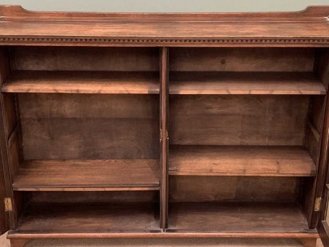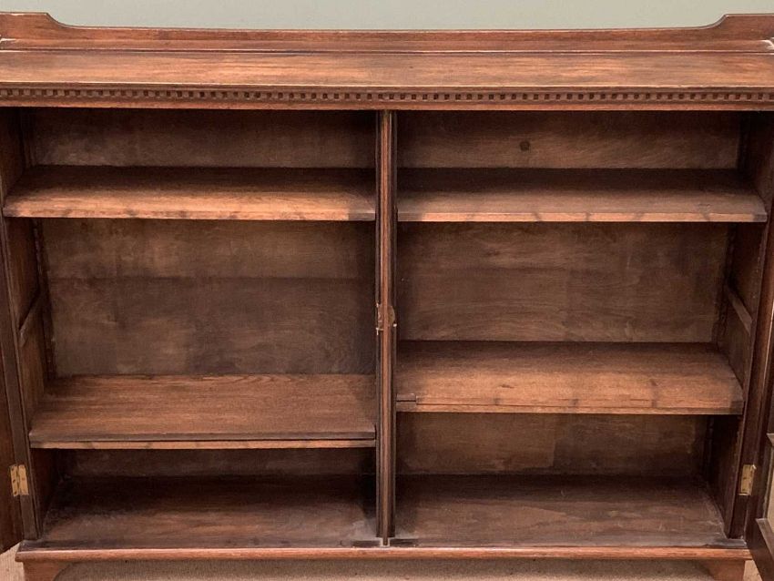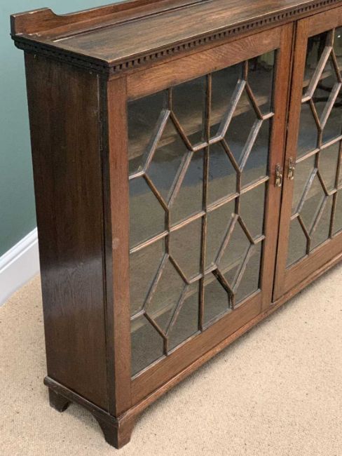 BOOKCASE CUPBOARD in polished oak with twin astragal glazed doors and dentil cornice, 106cms H, 141cms W, 30cms D