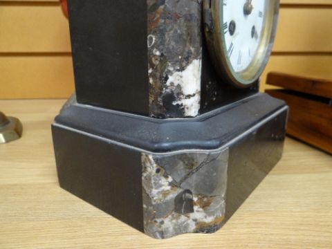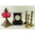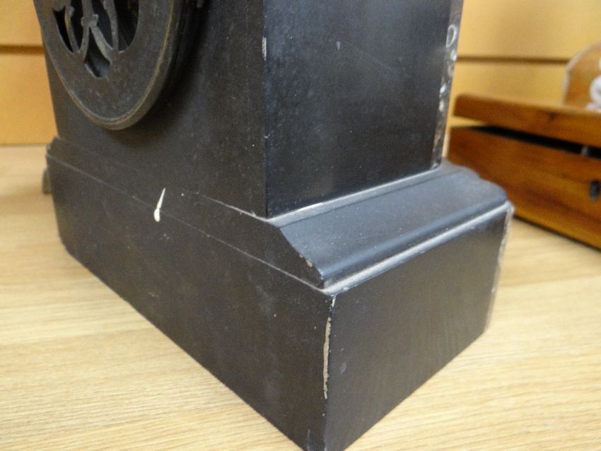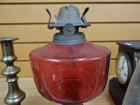 FRENCH SLATE MANTEL CLOCK, CANDLESTICKS & LAMP, the clock movement stamped A&N France, 21.5cms high, the oil lamp with pierced heron ornamented brass foot and cranberry reservoir (5)