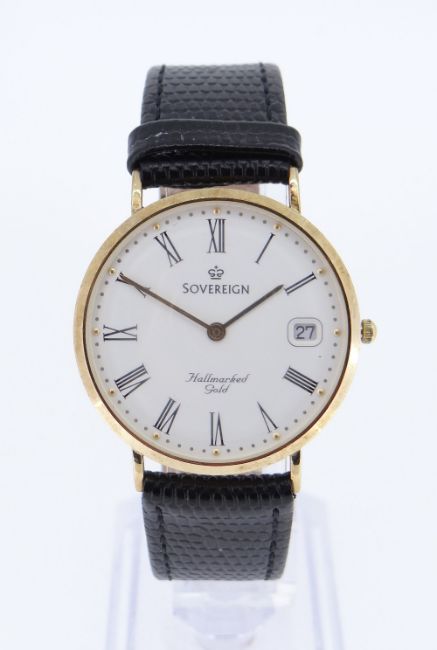 9CT GOLD ‘SOVEREIGN’ GENTS WRISTWATCH, with date aperture, lizard calf strap in Marvin Revue watch boxProvenance: deceased estate Neath Port Talbot, consigned via our Carmarthen Office