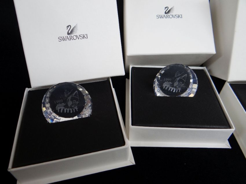SWAROVSKI CRYSTAL '1999 PIERROT DISC' PAPERWEIGHTS, signed, original boxes (4)