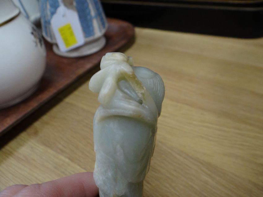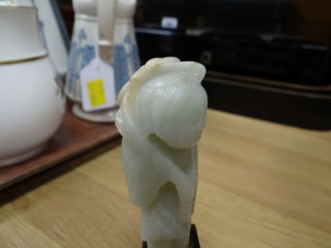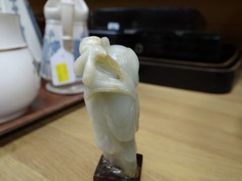 CHINESE CELADON JADE CARVING OF A BOY, holding a flowering lotus branch, hadwood base, overall 10cms h
