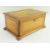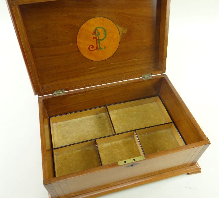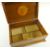 THREE MUSIC BOX COLLECTIBLES, comprising Fieldings Crown Devon Fox Hunting box & cover (music box not working), Fieldings Crown Devon Widdicombe Fair tankard, and a Swiss burr yew marquetry box together with EDWARDIAN MARQUETRY TABLE BOX, tulipwood crossbanded lid decorated with rural scene with cow, boat and river in specimen woods, crossbanded sides, lozenge escutcheon, pad feet, inner lid inlaid with JP monogram, inner tray, 35 x 23 x 15cms (4)