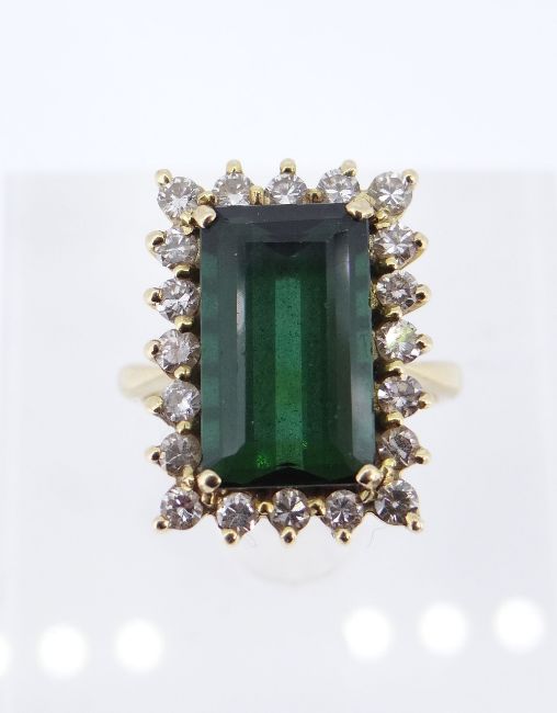 18CT GOLD GREEN TOURMALINE & DIAMOND CLUSTER RING, the central green tourmaline (13 x 8mms) surrounded by twenty diamonds, ring size J, 5.3gmsProvenance: deceased estate Neath Port Talbot, consigned via our Carmarthen Office