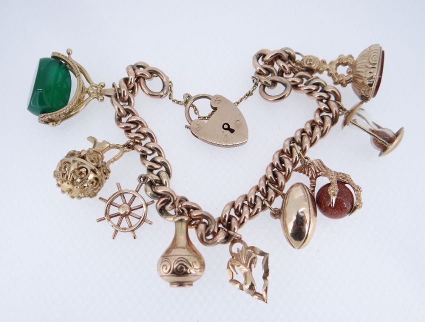 9CT GOLD CHARM BRACELET, the curb link chain with heart shaped padlock, having an assortment of nine 9ct gold charms including carnelian seal, rugby ball, ewer, ships wheel ETC, 41.9gmsProvenance: deceased estate Carmarthenshire, consigned via our Carmarthen Office