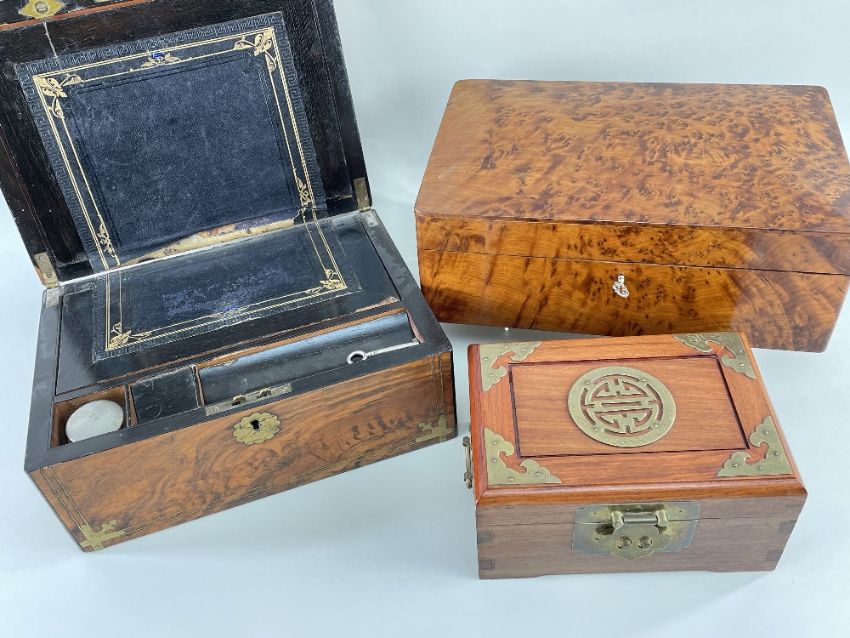 19TH CENTURY WRITING SLOPE & TWO OTHER BOXES, the walnut slope inlaid in brass, secret compartment within, 30cm, modern burr yew box with inner tray, 31.5cms and a Chinese hardwood casket, 20cms w. (3)