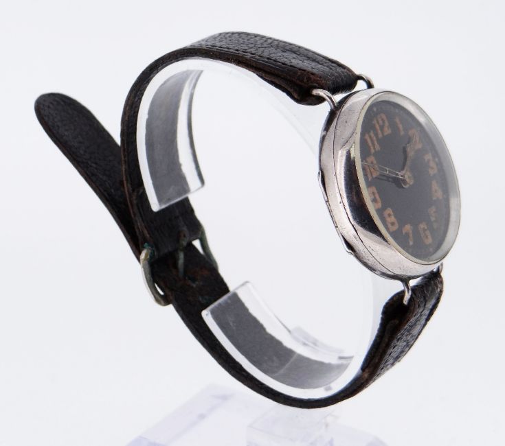 SILVER TRENCH WATCH, c.1915, black dial with luminous Arabic numerals, cathedral hands, Swiss 15-Jewel 'Marconi Lever' movement, hinged back number 2567, wire lugs, import marks, 33mm diam.Comments: back slightly dented, minute hand lacks lume, not working at present.