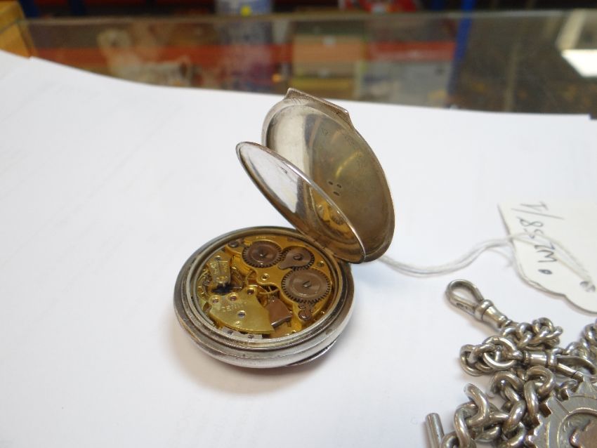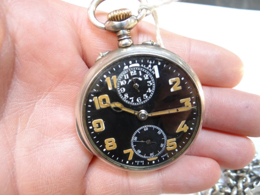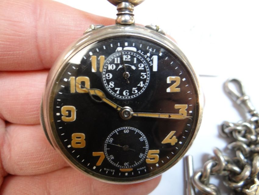 ZENITH SILVER GENT'S POCKET WATCH WITH ALARM FUNCTION, open face top wind, black dial with Arabic numerals, cathedral hands, subsidiary dials for running seconds and alarm setting, signed movement & dial, 48mms diam. with silver Albert chain, T-bar and pendant,155.1gmsProvenance: deceased estate Swansea, consigned via our Carmarthen OfficeComments: Movement - good overall, ticks when wound, alarm functions as normal. Dial - gereally good with slight wear to alarm sub dial, 11,1 & 2 with worn lume. Glass - v. minor surface scrtches. Hands - good with lume losses to both. Case - good overal, minor surface scratches,. Crown - gold plate worn allong the edges.