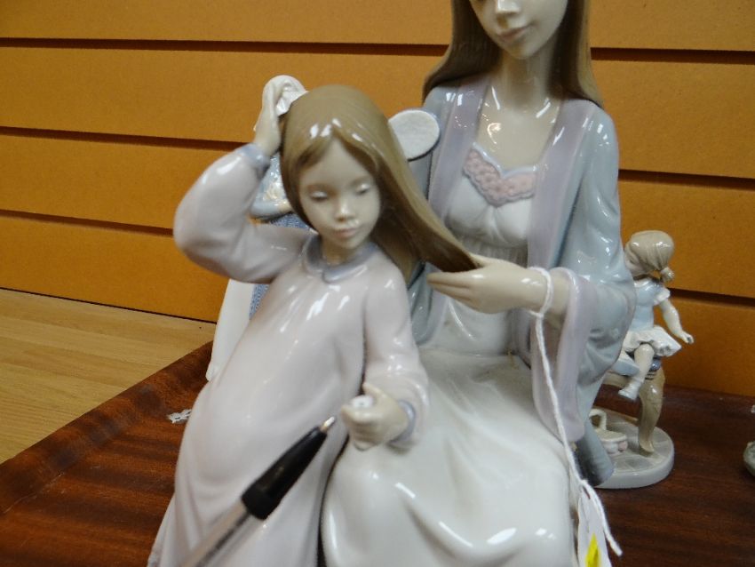 SEVEN LLADRO & NAO PORCELAIN FIGURES including a Lladro group no. 5757 'Beautiful Tresses', 30cms high (7)