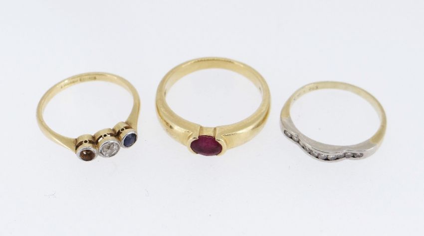 THREE GOLD GEM SET RINGS comprising 14ct gold diamond chip ring, 18ct gold and platinum diamond and sapphire ring (one stone missing), and an 18k gold ruby ring, 8.4gms overall (3)Provenance: deceased estate Ceredigion, consigned via our Carmarthen Office