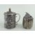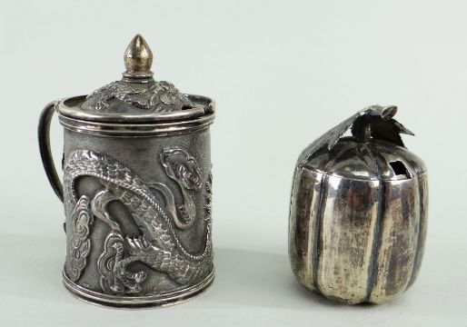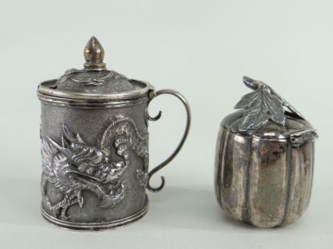 ASSORTED CHINESE WHITE METAL TABLE CRUETS, including dragon mustard pot, melon mustard pot, two pairs of hexagonal salts, and set of 6 teaspoons with shou charcter handles (one broken) (12)