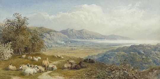 Sheep grazing on a headland with estuary beyond, titled to mount 'Crymlyn Bog and Neath River estuary Swansea Bay 1872', signed by both artists and dated
