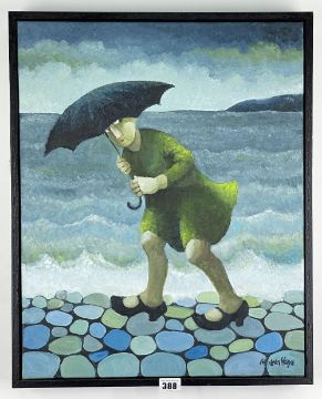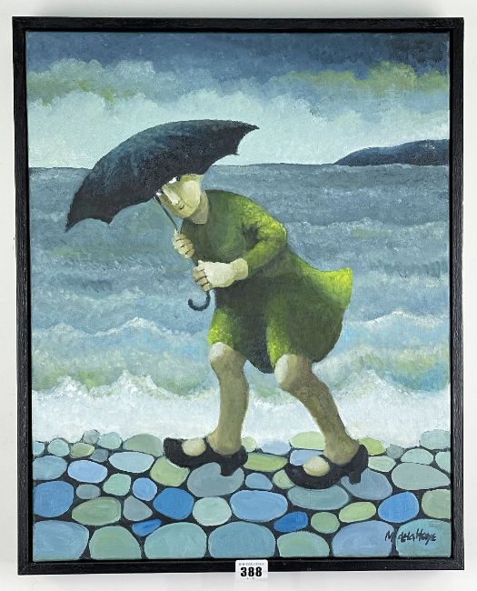 Woman walking on beach with umbrella, entitled, signed and dated verso 'Woman with Brolly, 2016'