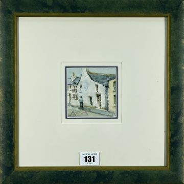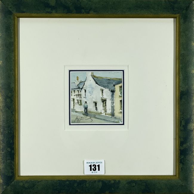 Figure walking along with whitewashed cottage, entitled 'Cottage Terrace, Mumbles', signed