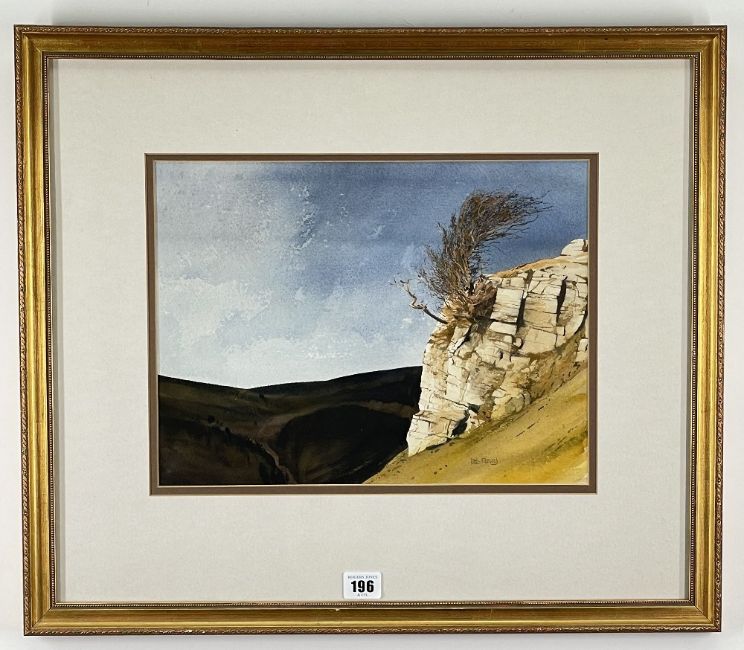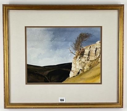 Rocky mountain outcrop with tree and blue sky, signed