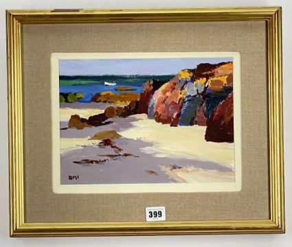 Beach clifff and boat, entitled verso on Fosse Gallery label 'White Boat, Iona West', signed with initials